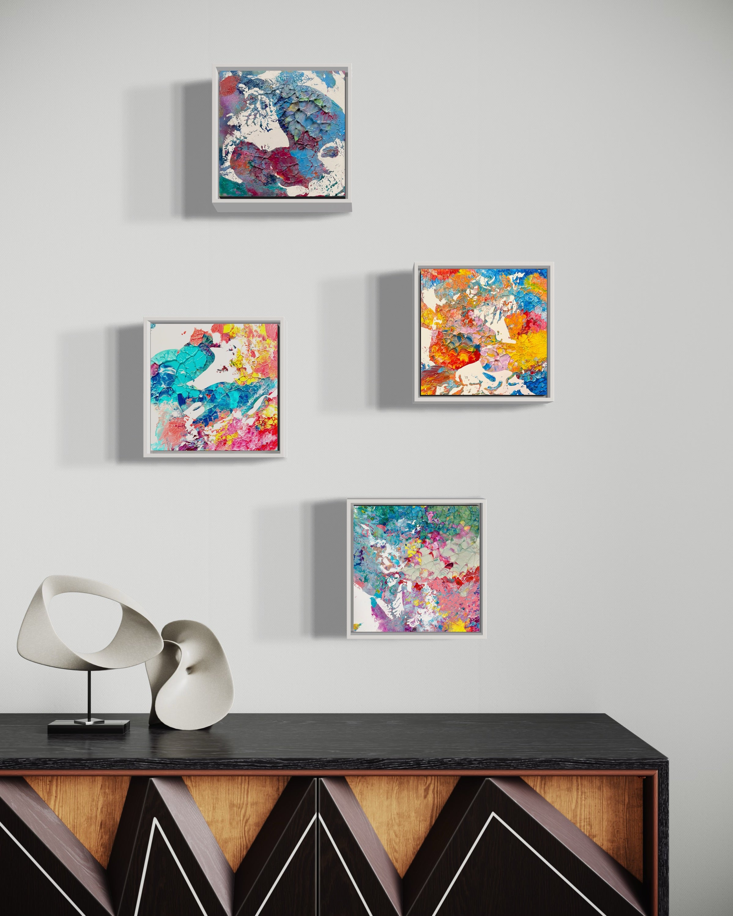 Each piece comes stretched and professionally framed ready to hang in a white floating frame, designed to complement the artwork’s depth and texture.